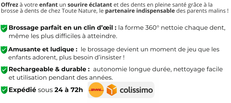 Fini les cris et les refus ! Grâce à sa technologie ultrasonique 360°, la brosse à dents pour enfant transforme la corvée du brossage en moment amusant et rapide. En seulement 60 secondes, elle nettoie chaque dent sans effort et fait du brossage un jeu que les enfants adorent.