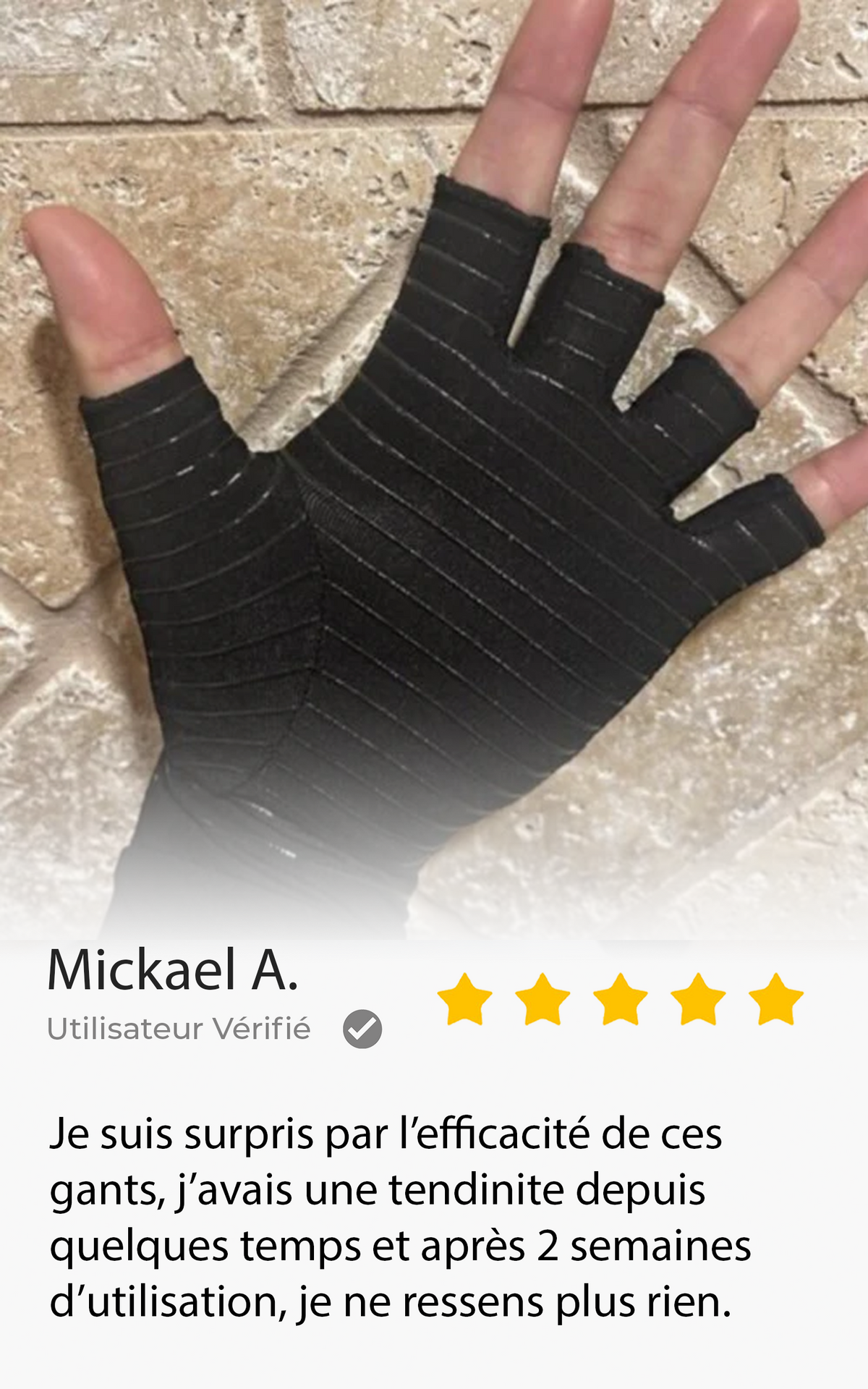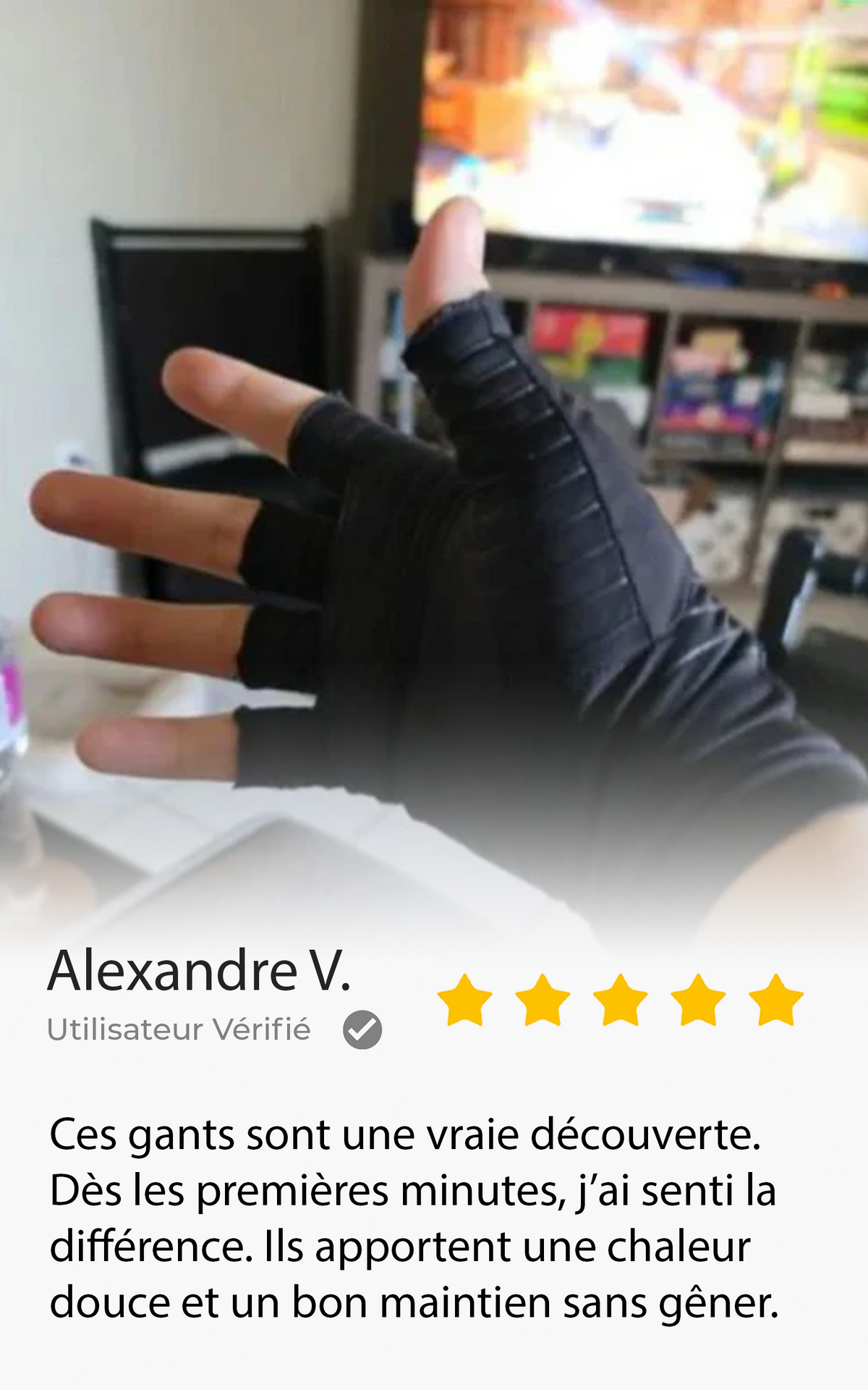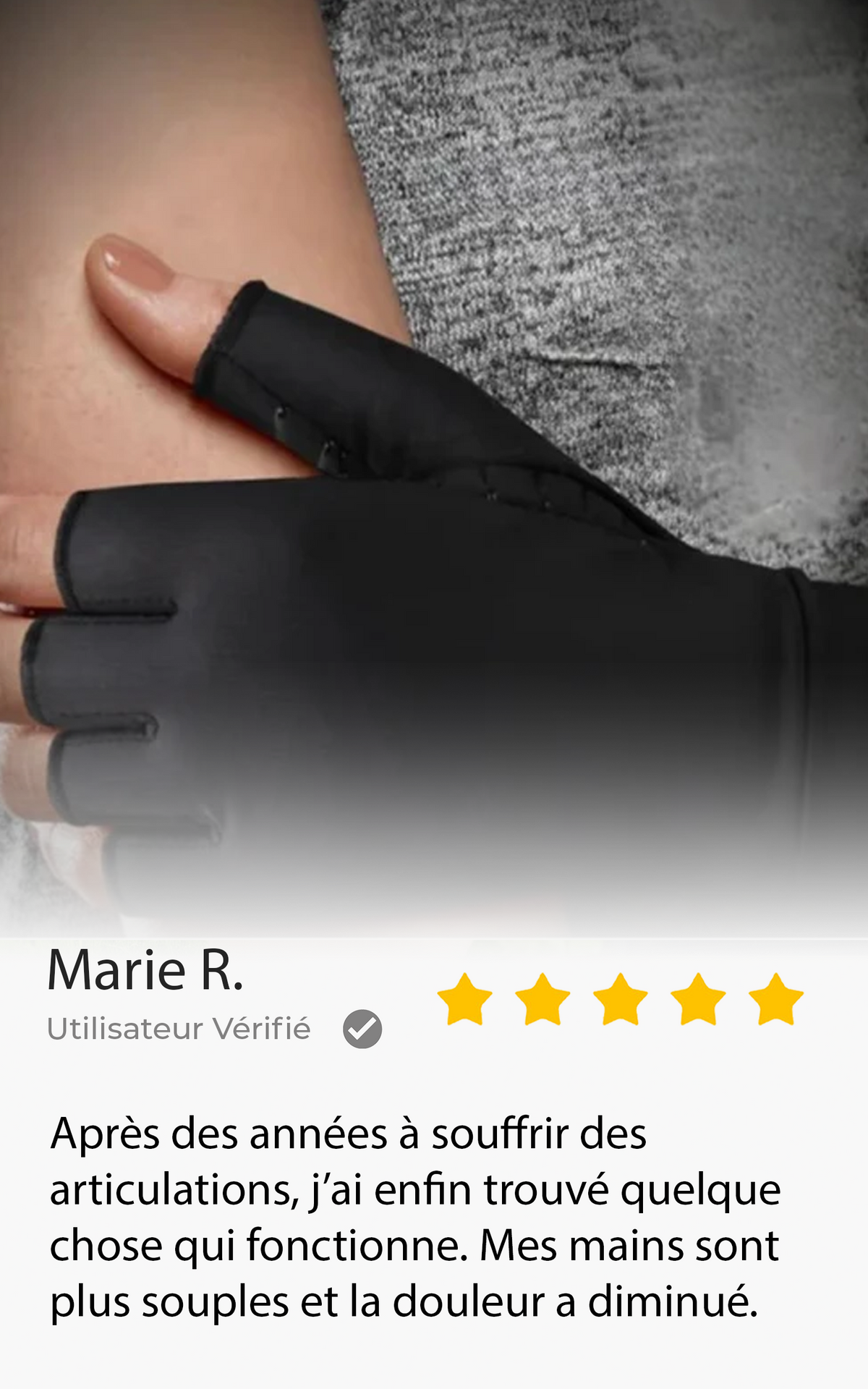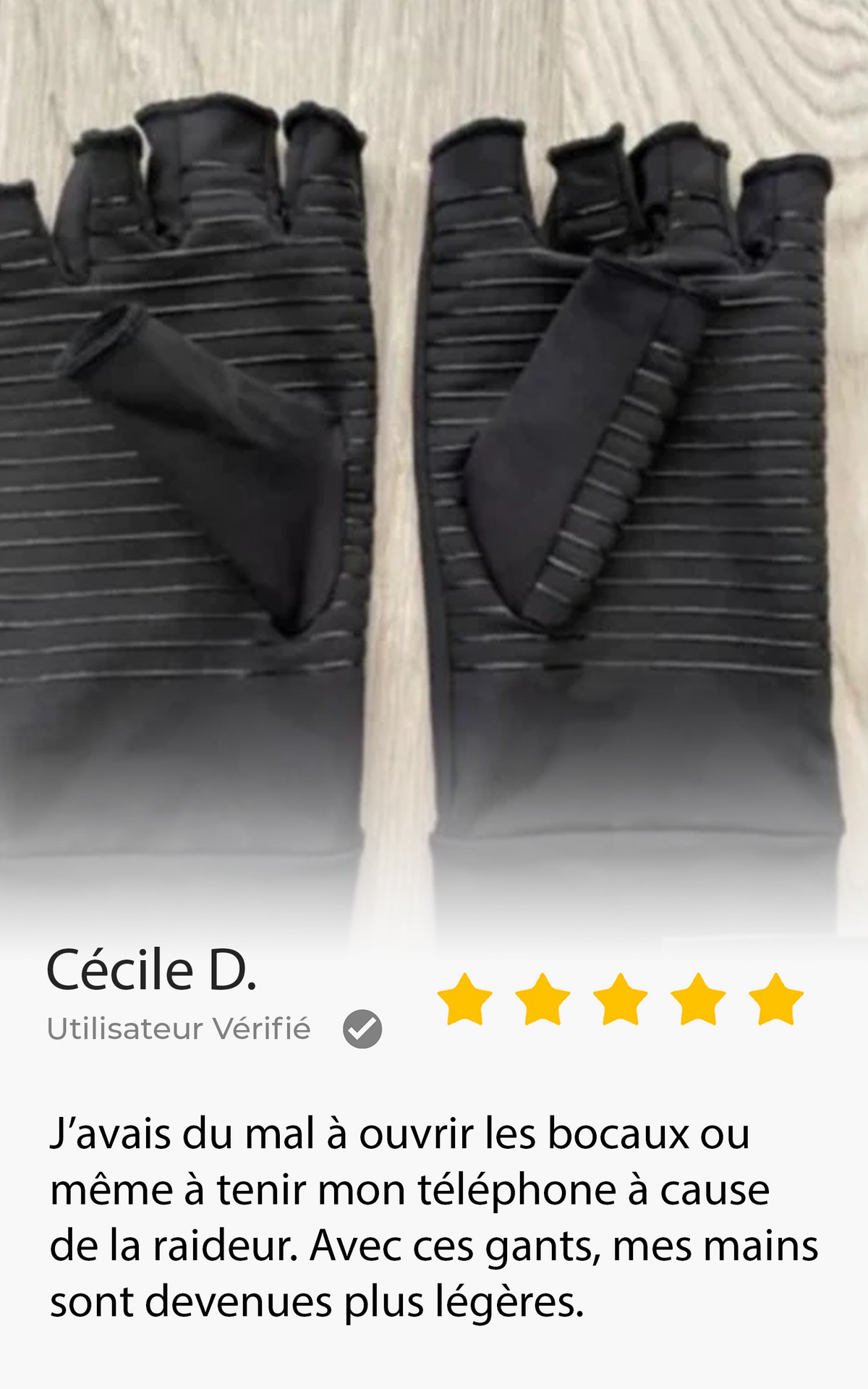 Qu'il s'agisse d'arthrose, de syndrome du canal carpien, de tendinite ou de raideur matinale, nos gants vous aide à retrouver confort et contrôle, afin que vous puissiez à nouveau bouger librement.