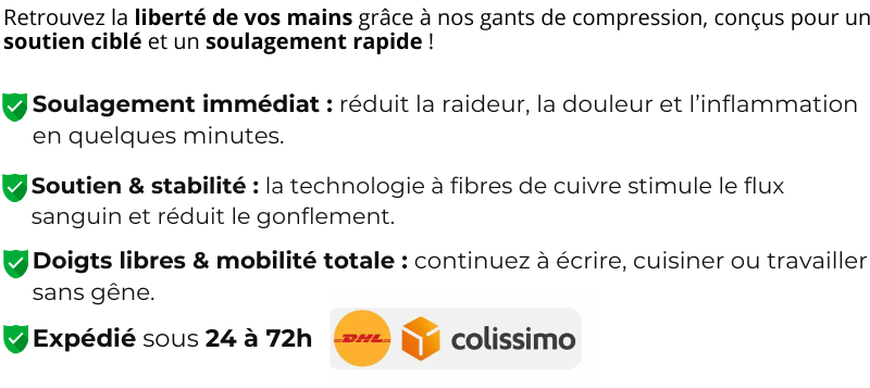 Grâce à leur conception ergonomique et leur compression ciblée, ces gants soulagent instantanément la douleur, la raideur et l’inflammation des mains pour un confort retrouvé dès les premières minutes.