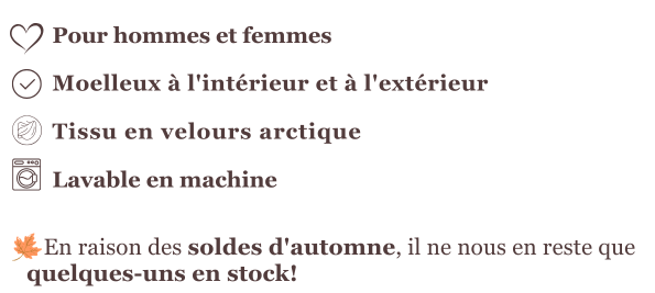 Grâce à sa matière respirante et douce, il garde la chaleur sans étouffer. Tu restes à l’aise toute la journée, que tu sois à la maison, au travail ou en balade.