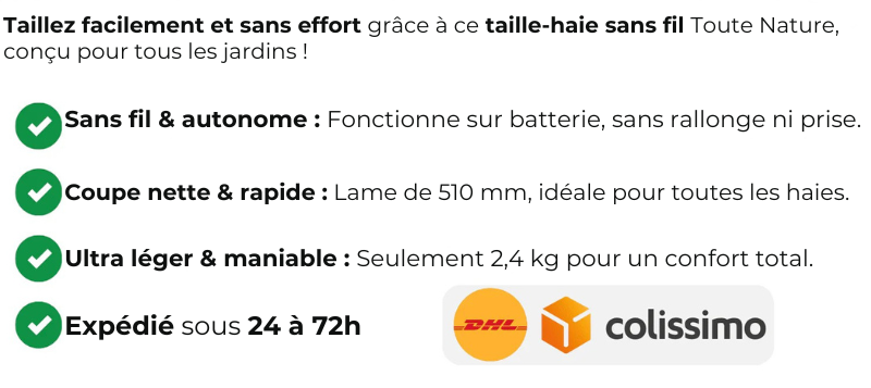 Léger, silencieux, simple à utiliser… Ce taille-haie vous redonne le plaisir d’entretenir votre jardin, sans les contraintes d’un outil thermique ou filaire. Vous profitez d’un moment de calme, tout en gardant le contrôle total sur votre outil.